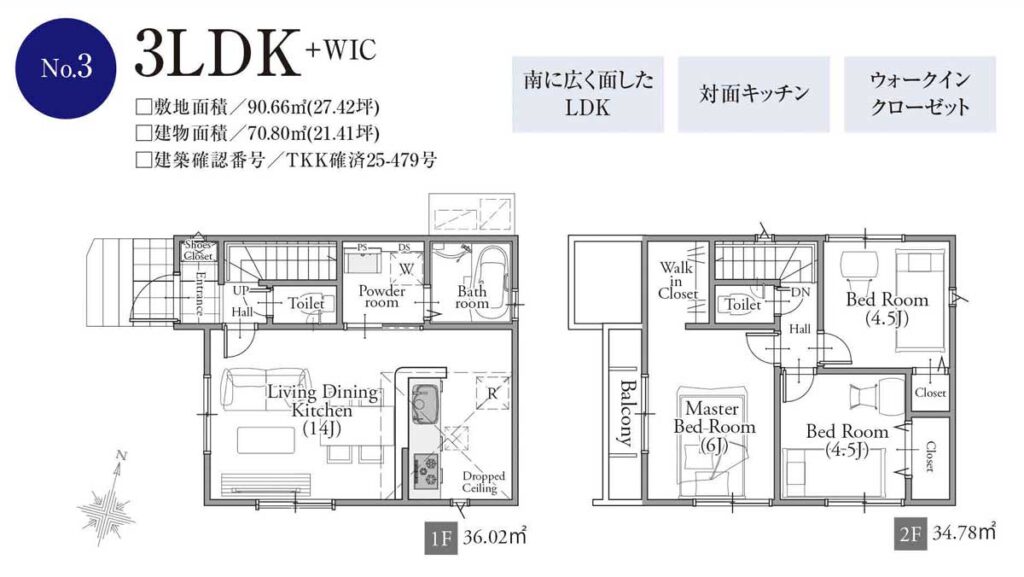 | 3号棟 | 90.66m2 | 70.80m2 | 4,290万円(税込) |